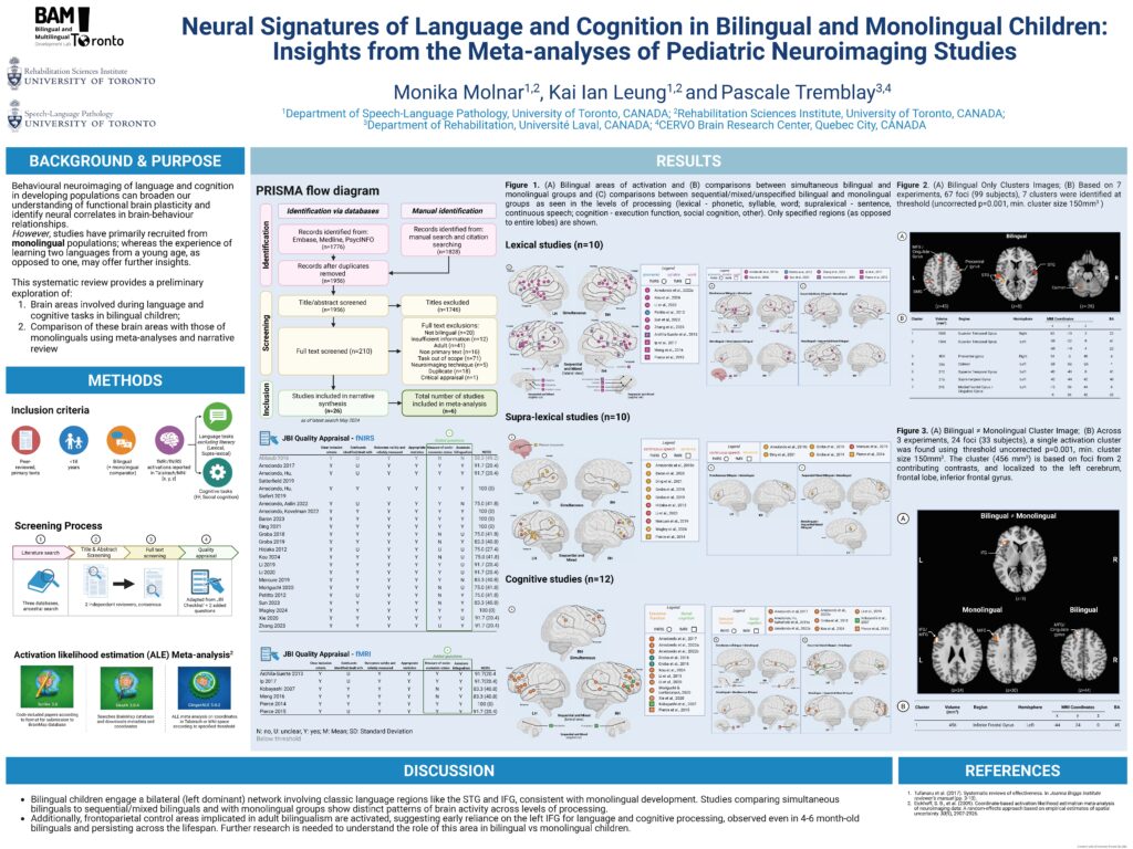 Leur affiche, intitulée «Neural Signatures of Language and Cognition in Bilingual and Monolingual Children: Insights from Meta-analyses of Pediatric Neuroimaging Studies», explore les bases neurales du langage et de la cognition chez les enfants bilingues et monolingues, en s’appuyant sur une synthèse rigoureuse d’études de neuroimagerie (IRM et fNIRS) pédiatrique effectuée par Kai Leung, une étudiante au doctorat supervisée par Monika. Ces travaux viennent d’ailleurs tout juste d’être acceptés pour publication dans la revue Aperture Neuro !