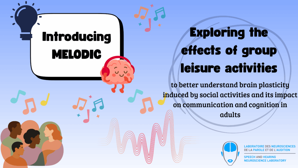 We are excited and proud to present our new project MELODIC, a large-scale longitudinal randomized study that will keep us busy for at least the next four years! In preparation for a long time, the project officially began in the fall 2024 with funding applications, team assembly, ethical approval from the CIUSSS-CN Neuroscience Research Ethics Committee, the purchase of equipment, the recording of stimuli, and the elaboration of tests, MRI sequences, and protocols. The project will be divided into four waves of data collection over four years, during which 150 participants will be recruited. The first wave began in May 2025. Participant recruitment took place from May to July, and data collection started in July. It will continue until next spring and then follow the same schedule in 2026, 2027, and 2028!