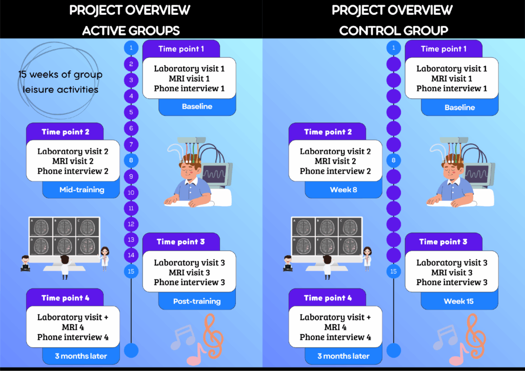 Participation in the project is intensive! Indeed, the study involves 7 visits to the CERVO Brain Research Centre and 4 phone calls. Specifically, after an initial screening interview, participants are randomly assigned to one of three groups (two activity groups and one control group). This procedure—randomization—allows for systematic and reliable comparisons between groups. The first two groups take part in a group activity for 15 weeks (one weekly session of approximately 2.5 hours) led by professionals. The third group, the control group, completes all data collection sessions but does not participate in any activity.