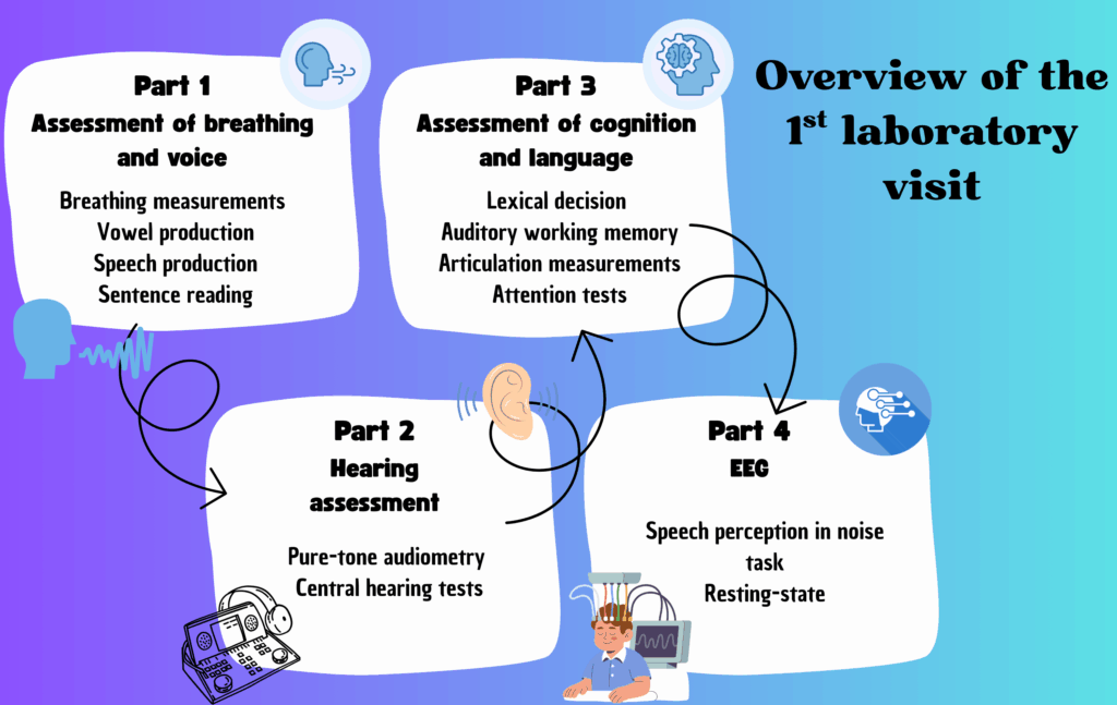 The first laboratory session (Figure 3) begins with a series of breathing tests, followed by vocal tasks (vowel production, speech production, and sentence reading). Next, assessments of hearing (pure-tone audiometry and central hearing), language (lexical decision, auditory working memory, articulation), and auditory attention are conducted. The session ends with a measurement of brain activity using electroencephalography (EEG). During the EEG, participants complete a speech perception in noise task, as well as a resting-state sequence (Figure 5).
