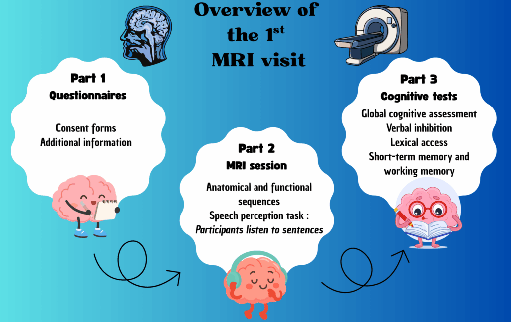 The first MRI session (Figure 3), lasting approximately two hours, begins with several questionnaires, including consent forms and questions to gather general information about the participants to adding to the initial phone interview (employment, leisure activities, etc.). This is followed by an MRI session. This one-hour session includes measures of brain anatomy and function. During the measurement of brain activity, participants complete a sentence-listening task, which will allow us to analyze how participating in a social activity affects language processing. After the MRI session, cognitive tests are conducted, measuring verbal inhibition, lexical access, short-term memory, and working memory.