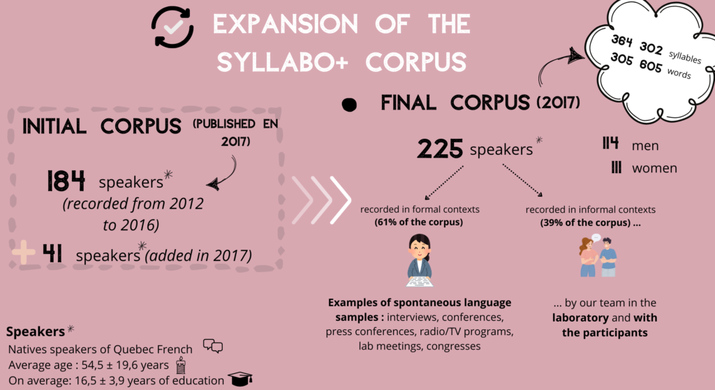 In 2016, two databases were created: the phoneme and syllable databases, offering an inventory of the syllables and phonemes of spoken Quebec French. These databases allow for in-depth research on the structure and frequency of these language units. They provide information on how frequently certain phonemes and syllables occur, their transition probabilities (e.g., the likelihood that one syllable follows another), and the statistical relationships between them. Considering that few tools exist for the study of spoken Quebec French, SyllabO+ represents a valuable resource for research across multiple fields, including psycholinguistics, phonetics, speech-language pathology, and the cognitive neuroscience of language. One of its major strengths lies in its focus on spontaneous spoken language, offering an authentic snapshot of everyday language use.