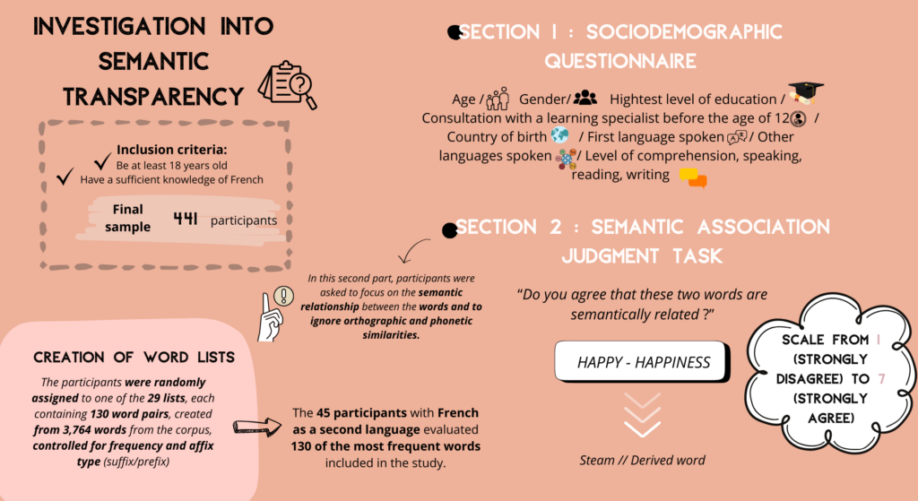 The study therefore focused on how speakers perceive this transparency, taking into account several factors: the type of affixation used in forming the derived word, and the characteristics of the participants, including their level of French proficiency (French as a first or second language). This research contributed to a richer morphological analysis of spoken Quebec French. Evaluating semantic transparency is essential, as morphology plays a significant role in reading fluency and word comprehension, especially for individuals who experience difficulties with word decoding.