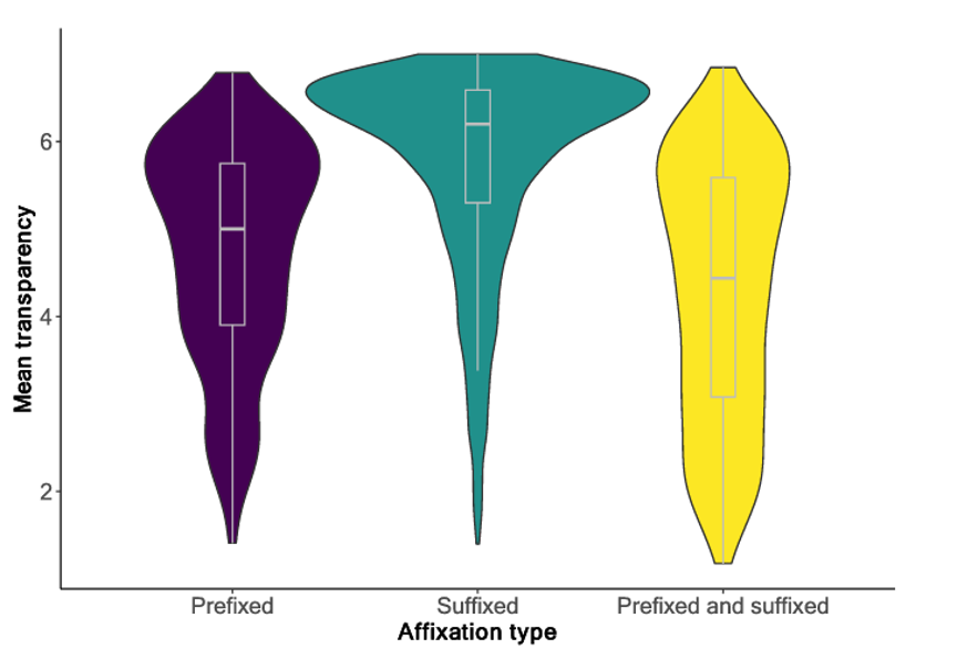 Finally, the semantic transparency study highlights that speakers do not perceive semantic transparency in a uniform way. Researchers can therefore select words from the study with consistent transparency ratings to create controlled psycholinguistic tasks.