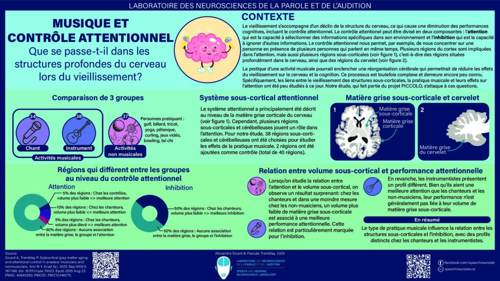 Our previous study showed that amateur musicians performed better than non-musicians on specific cognitive tasks, particularly those measuring inhibition and working memory, although these advantages were not global. In the present study, we examined the relationship between brain aging, more specifically the subcortical areas forming the attention network (basal ganglia, thalamus, amygdala, cerebellum) and attentional abilities in adults practicing musical activities or not, focusing on brain plasticity mechanisms. To learn more about brain organization, see our publication on this topic here.