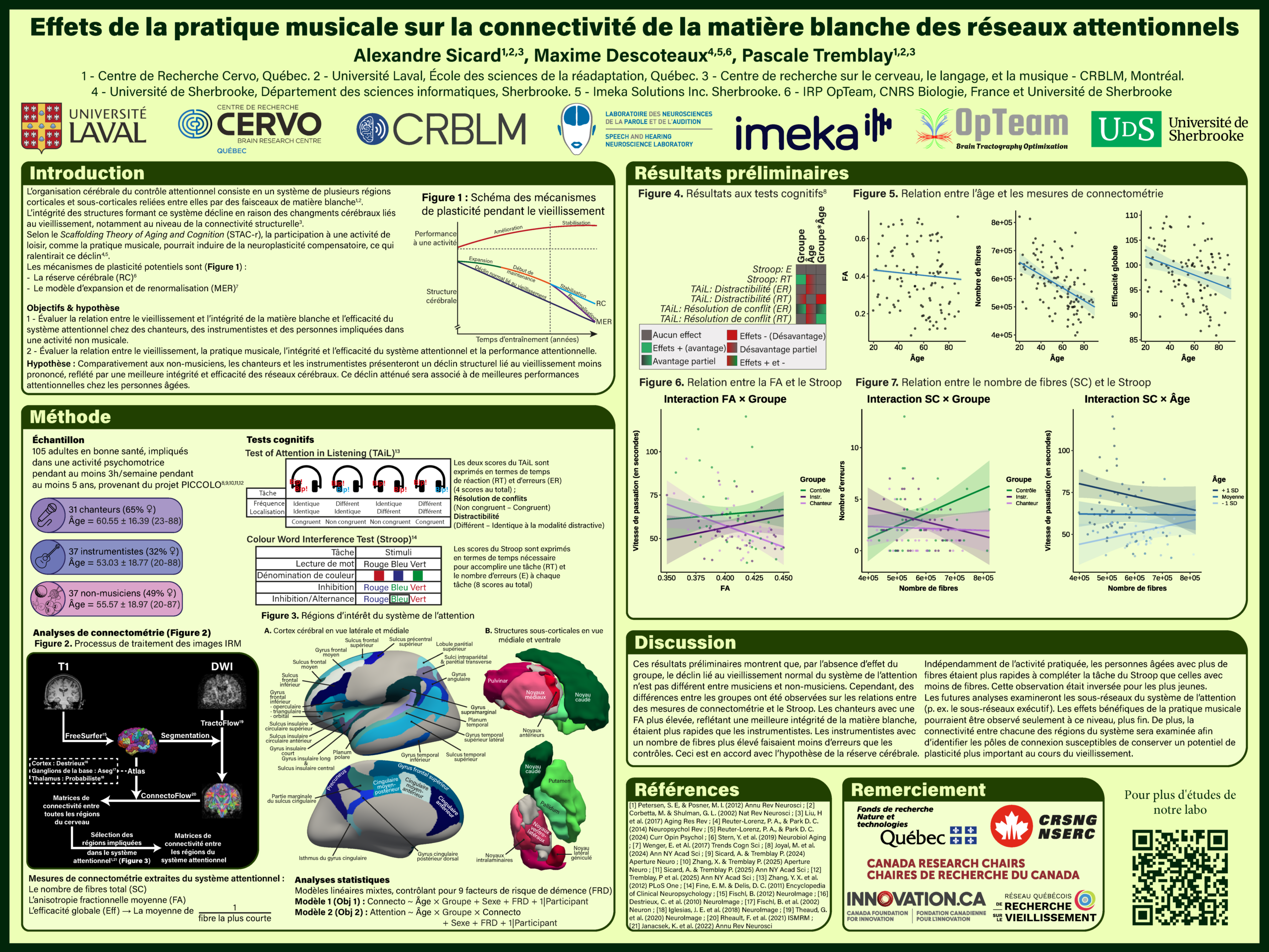 Alexandre, doctorant en sciences de la réadaptation, a présenté ses analyses les plus récentes du projet PICCOLO, notre projet de recherche sur les effets de la Pratique d’un Instrument ou du Chant sur la COgnition, le Langage et l’Organisation cérébrale, financé par les fonds de recherche du Québec — Nature et technologies (FRQNT) et le Conseil de recherches en sciences naturelles et en génie du Canada (CRSNG). La pratique musicale sollicite de façon intensive l’attention, notamment la capacité à se concentrer sur un son spécifique tout en ignorant les distracteurs — une habileté qui tend à décliner avec l’âge. Alexandre cherche à déterminer si cette pratique soutenue laisse des traces dans l’organisation du cerveau. Il a récemment entrepris l’analyse de la connectivité structurelle, mesurée grâce à l’IRM de diffusion, à l’intérieur du réseau cérébral qui contrôle l’attention, en comparant des chanteurs, des instrumentistes et un groupe contrôle sans pratique musicale.