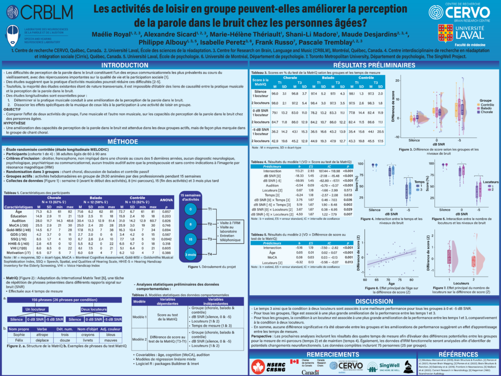 Maélie, étudiante à la maîtrise en sciences de la réadaptation, a présenté les premiers résultats de notre étude longitudinale MELODIC. Ce projet de grande ampleur s’intéresse à la plasticité cérébrale induite par des activités de loisir en groupe. L’objectif est de mieux comprendre comment certaines activités peuvent induire des changements de la structure et du fonctionnement du cerveau adulte, et favoriser un vieillissement en santé en soutenant la communication et les fonctions cognitives et en réduisant le stress. Dans le cadre du projet, nous comparons les impacts d’une activité de groupe musicale, pratiquée pendant 15 semaines, à ceux d’une activité de groupe non musicale, également pratiquée pendant 15 semaines. Un groupe témoin nous permet de contrôler pour les effets d’apprentissage et le passage du temps en effectuant tous les tests, mais sans participer à une activité. Dans le cadre de sa maîtrise, Maélie s’intéresse à l’impact des activités de groupe sur la perception de la parole dans le bruit et ses mécanismes sous-jacents, mesurés via IRM.