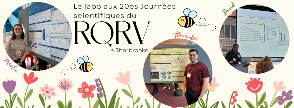 Trois étudiants du labo, Alexandre Sicard, Maélie Royal et David Ratelle, ainsi que Pascale Tremblay, la directrice du labo, ont participé aux journées scientifiques du RQRV cette année et y ont présenté les résultats de trois grands projets du labo : PICCOLO, NeuroSPiN et MELODIC. Alexandre et Maélie y ont présenté des affiches, alors que David a effectué une présentation orale pour laquelle il a d’ailleurs gagné un prix.
