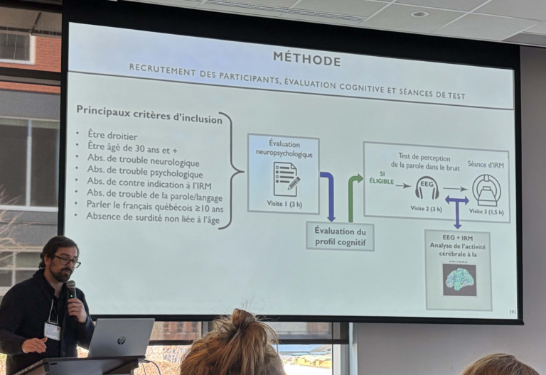David, audiologiste et doctorant en sciences de la réadaptation, a présenté les résultats de ses analyses du projet NeuroSPiN. L’objectif de cette étude, financé par les Instituts de recherche en santé du Canada (IRSC), est de mieux comprendre les mécanismes liés aux difficultés de perception de la parole dans le bruit (en anglais le « speech in noise » ou SPIN, d’où le nom du projet), lesquelles sont très prévalentes chez les personnes âgées, et qui apparaissent dès la fin de la trentaine. Comme la plupart des conversations ont lieu en présence de bruit (p. ex. au restaurant ou à la maison lorsque le lave-vaisselle fonctionne), ces difficultés peuvent avoir des conséquences importantes, notamment sur la participation sociale et le bien-être. Dans le cadre de son projet doctoral, David a analysé le signal cérébral mesuré au moyen de l’lectroencéphalographie pour comprendre les mécanismes cérébraux sous-jacents aux difficultés de perception de la parole dans le bruit.